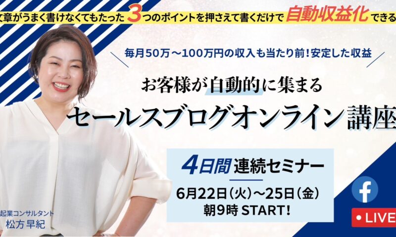 6月22〜24の4日間、Facebookグループにて「セールスブログオンライン講座」を無料で行います!